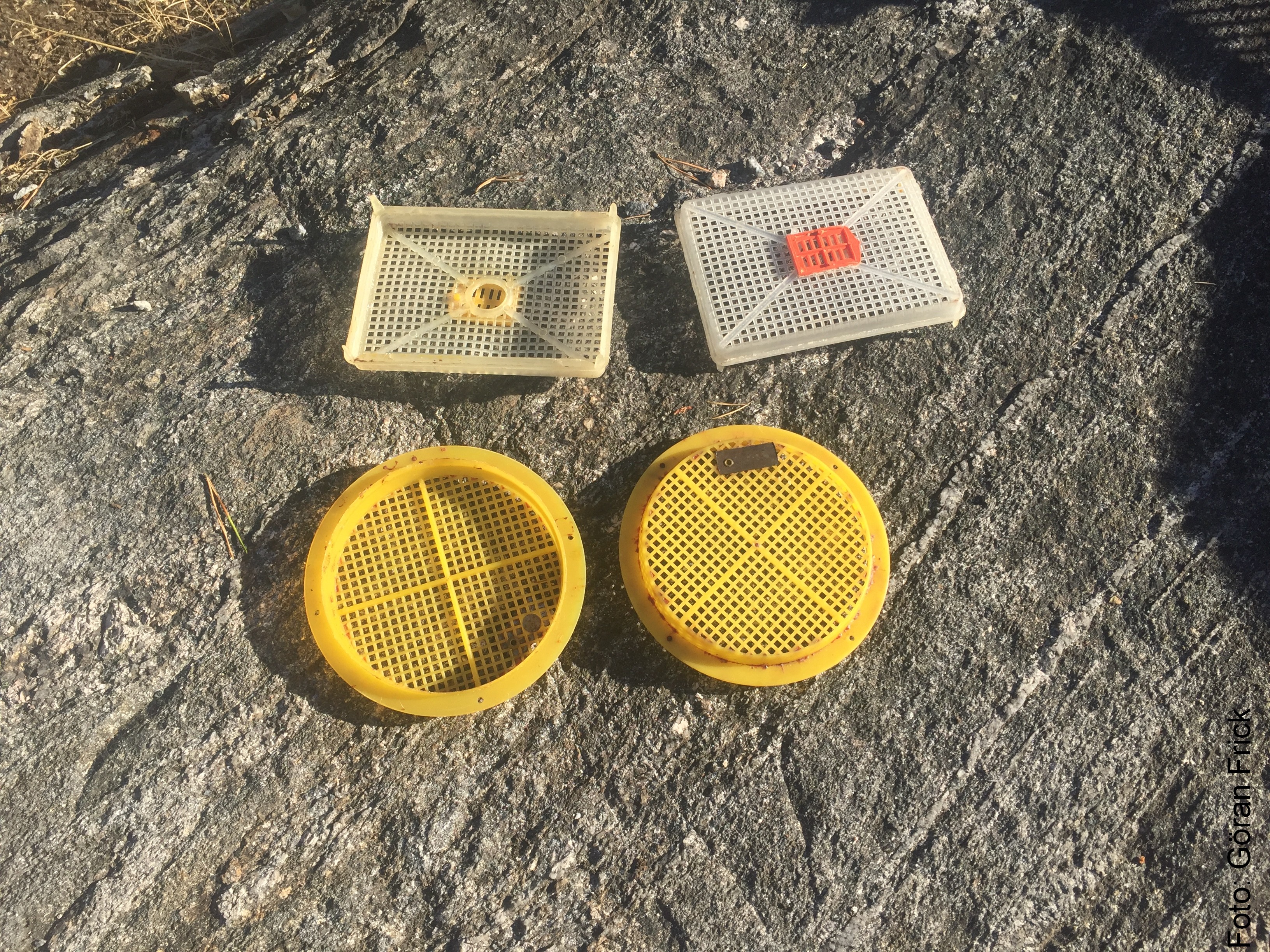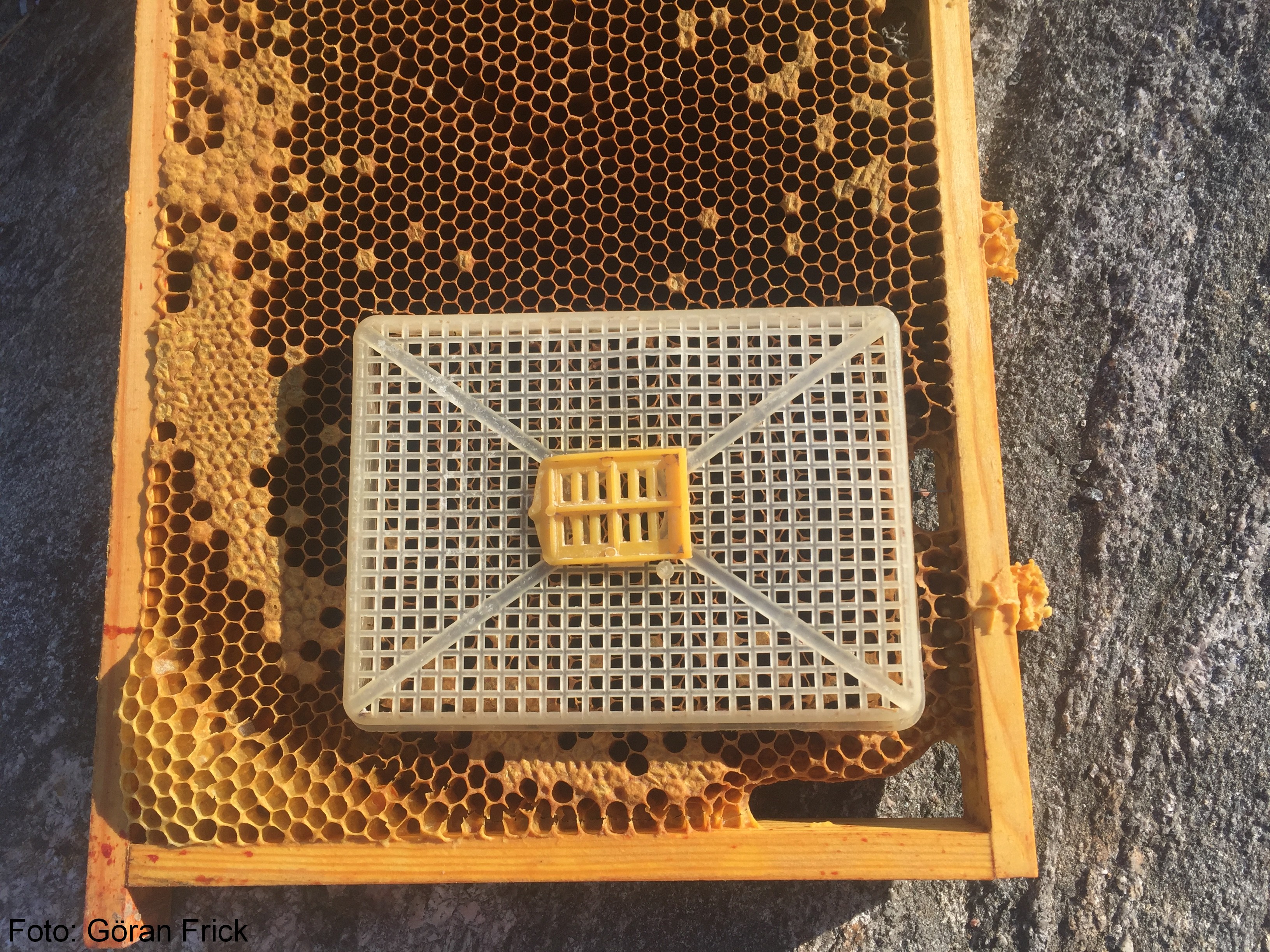 - Leta reda på en ram med utkrypande yngel. Kolla att drottningen inte går på ramen och sätt på påsticksburen över utkrypande yngel men på så sätt att det också finns tomma celler.