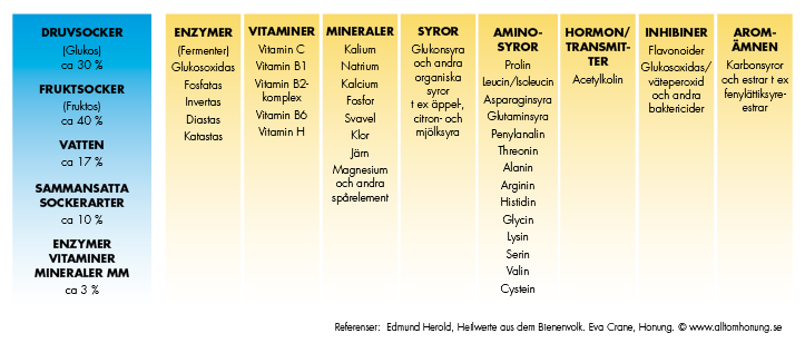 Mer detaljerat om honungens beståndsdelar, se tabellen här. Mer information om honungens kemiska sammansättning, här. En bra webbsida om honung: Allt om honung.